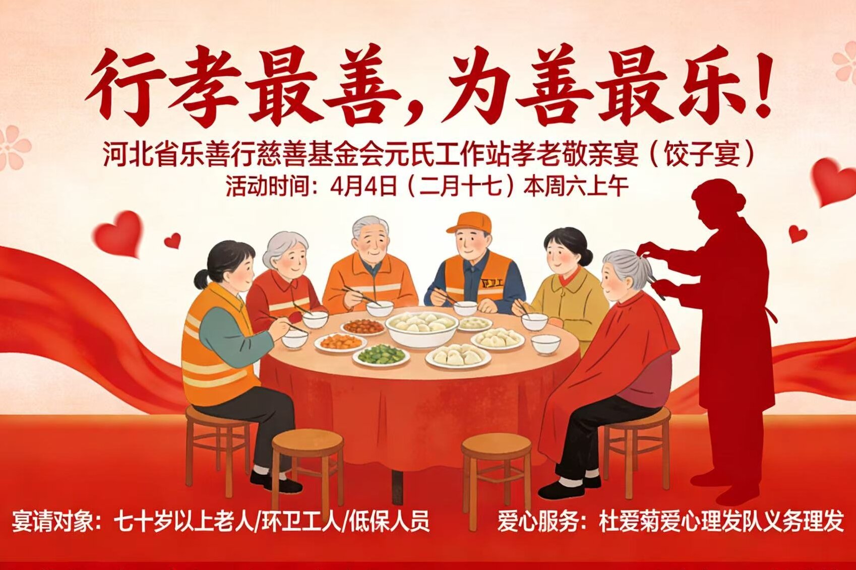 2026年4月4日(农历二月十七)上午,河北省乐善行慈善基金会元氏工作站携手元氏县孟村爱心人士李雪霞,于孟村学校举办孝老敬亲饺子宴活动,宴请七十岁以上老人,环卫工人及低保人员。让袅袅饺香弥漫村落,让浓浓孝爱温暖每一位老人,用最质朴的烟火气,书写最动人的公益篇章。